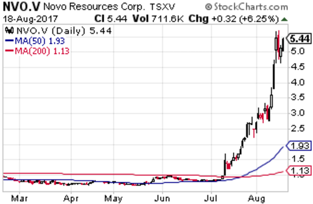 Novo Resources never really pulled back like I expected it to, so I had to buy at $4, but it is still up over 50% from that level. The story keeps getting better, and the company is simply masterful at exciting the market. This can easily double from here, and even more. I sold some of my shares for a trade, but will buy back on any meaningful pullback.